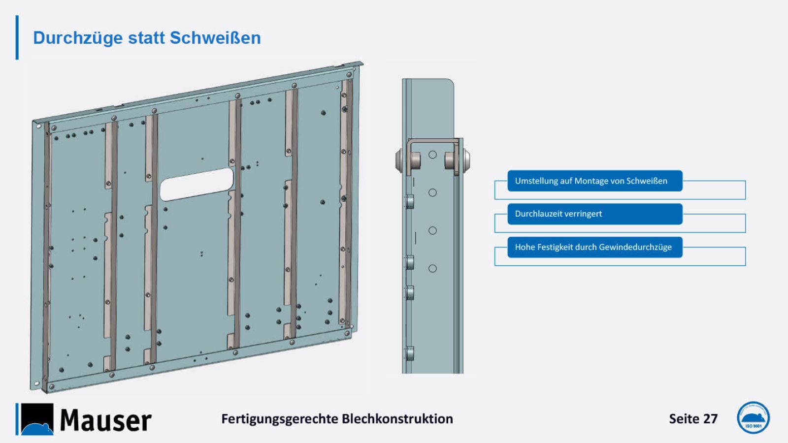 In diesem Beispiel wurden geschlossene Ecken durch Kantungen erzeugt und "verdrückt". Zur Stabilität muss lediglich an allen 4 Ecken jeweils 1 Schweißpunkt zur Stabilität gesetzt werden. Das Verschweißen der Kanten entfällt.